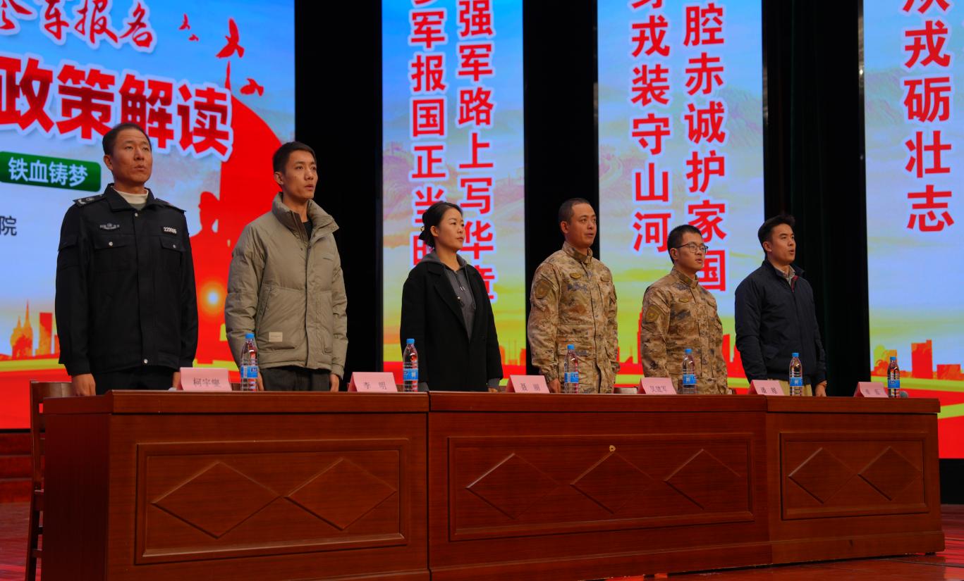 宣讲会伊始,全体人员起立,奏唱国歌。激昂的旋律在报告厅内回荡,庄严的氛围瞬间点燃了现场学子的爱国情怀与从军热忱。