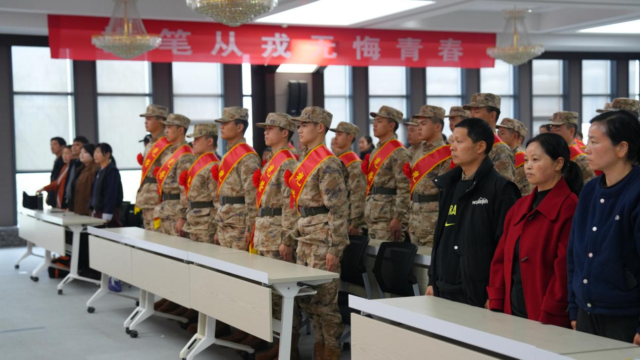 大会在庄严的国歌声中拉开帷幕,全体人员肃立行注目礼。新兵们身着崭新戎装,肩披鲜红绶带,胸戴光荣红花,身姿挺拔、英姿勃发,用坚定的神情展现出新时代大学生响应祖国号召、矢志强军兴军的昂扬风貌,更彰显出当代中国青年将个人理想融入强军梦、中国梦的坚定信念与使命担当。