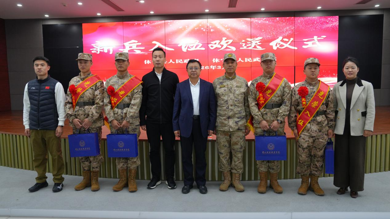 春潮砺剑践初心,青春逐梦赴军营。3月16日上午10时,休宁县2026年上半年春季应征入伍欢送大会隆重举行,我校校长、党委委员、副校长吴彬、学工部长聂丽应邀出席,与休宁县人武部相关负责同志、全体新兵及家属代表欢聚一堂,为即将奔赴祖国大江南北、投身国防事业的黄健职学子壮行鼓劲,送上母校的关怀与祝福。